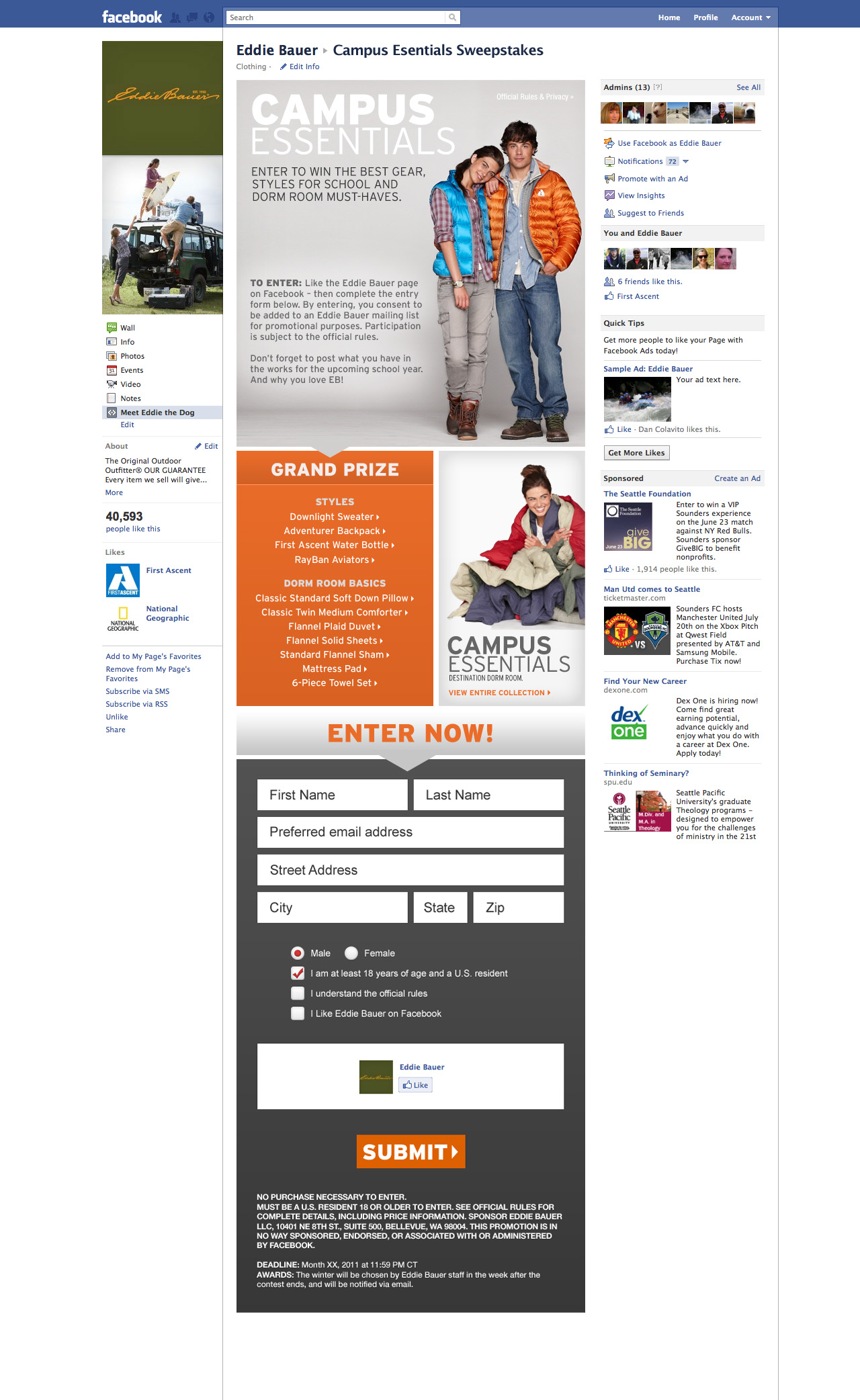 Created copy for Facebook sweepstakes contest designed to ramp up visibility of the Eddie Bauer Campus Essentials line. Successful completion of the project included collaborations with the social media manager and designers to create compelling copy that met Facebook guidelines for sweepstakes contests.